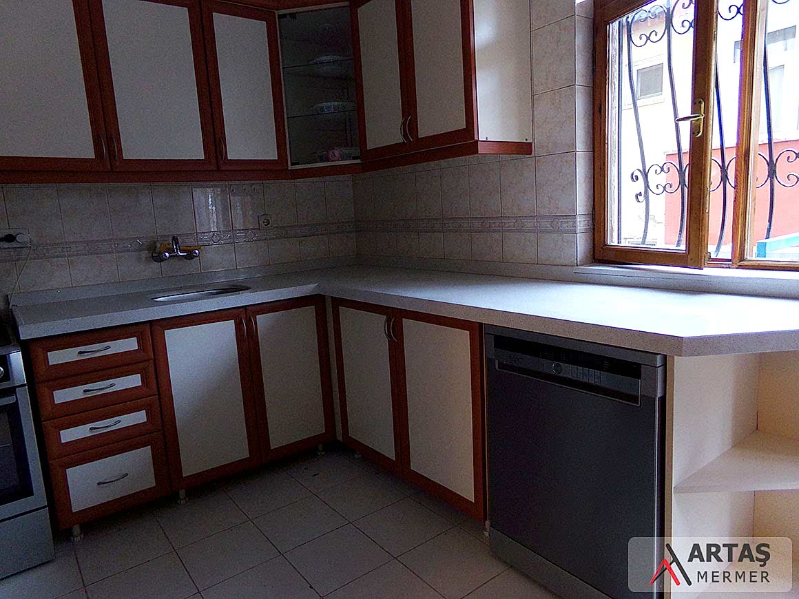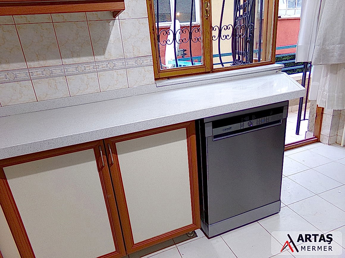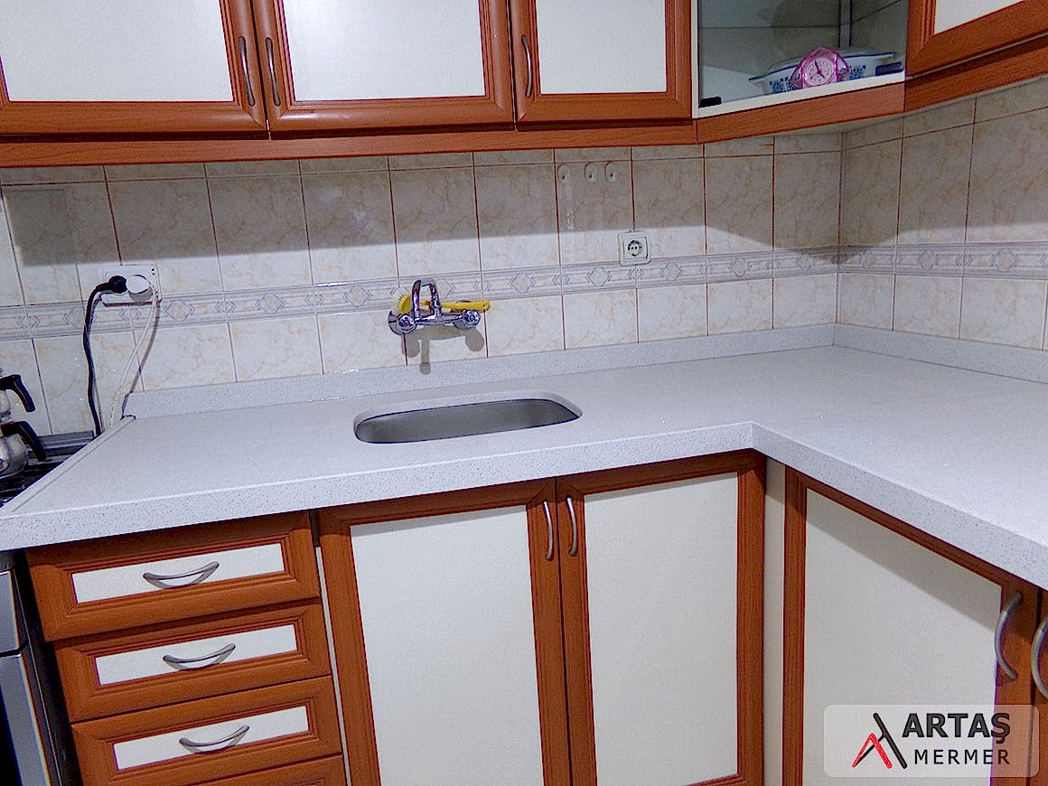 Lusetia White Calisco mutfak tezgahı çalışmamız Ankara ili – Keçiören ilçesinde yapılan ve standart ölçekli bir mutfak için 3 metre malzeme kullanılan bir uygulamadır. L tasarımlı olarak yaptığımız çalışmamızda bir kenar 45 derece eğimli olarak sonlandırılmıştır.